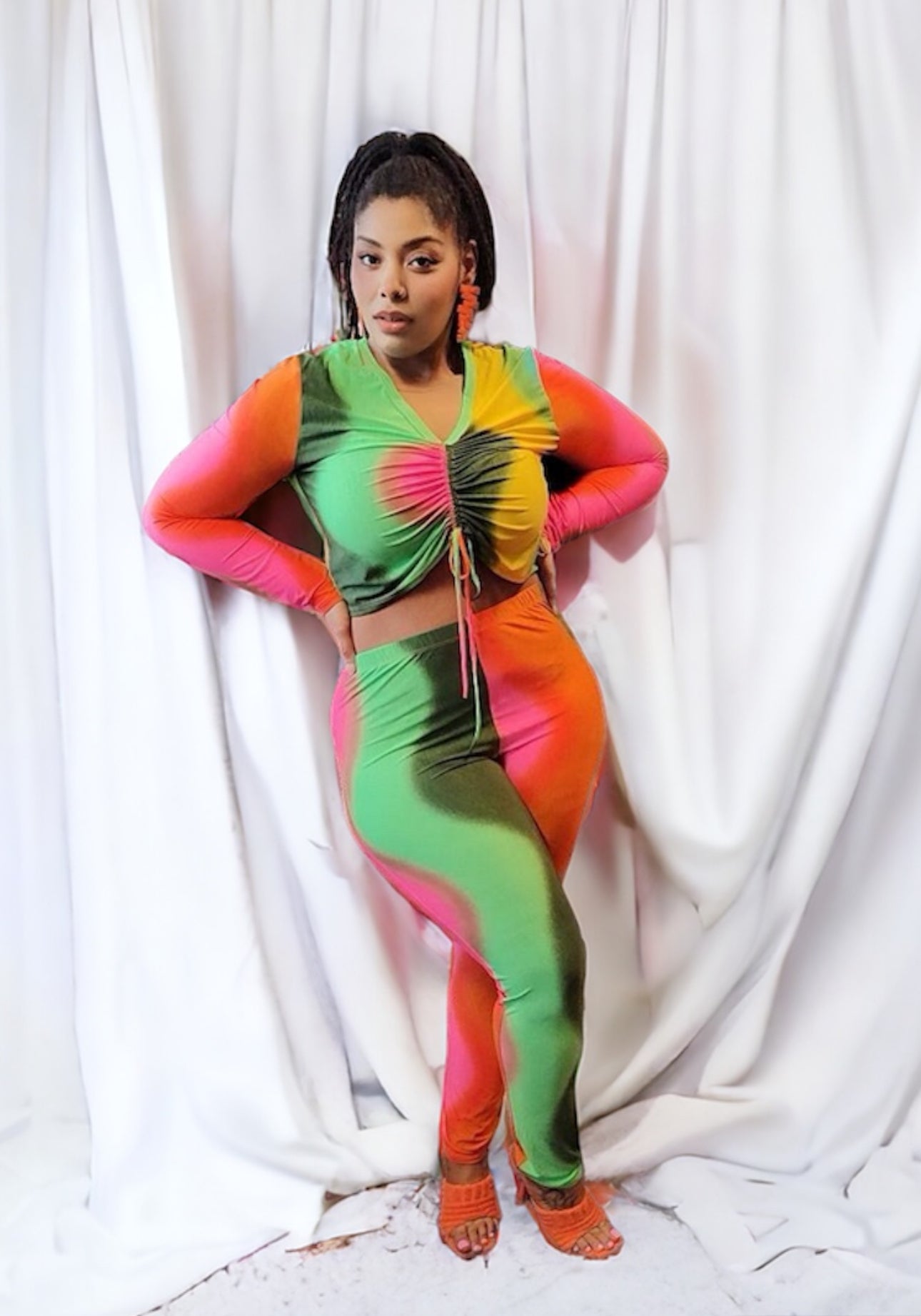 Conquer your fashion game with the Color Me Bad 2 Piece Set! This plus size set features a multi-color ruched crop top and pants, perfect for the spring and summer weather. With a nice stretch and bold design, this set will have you feeling confident and ready to take on any adventure. Model is wearing size 1X.