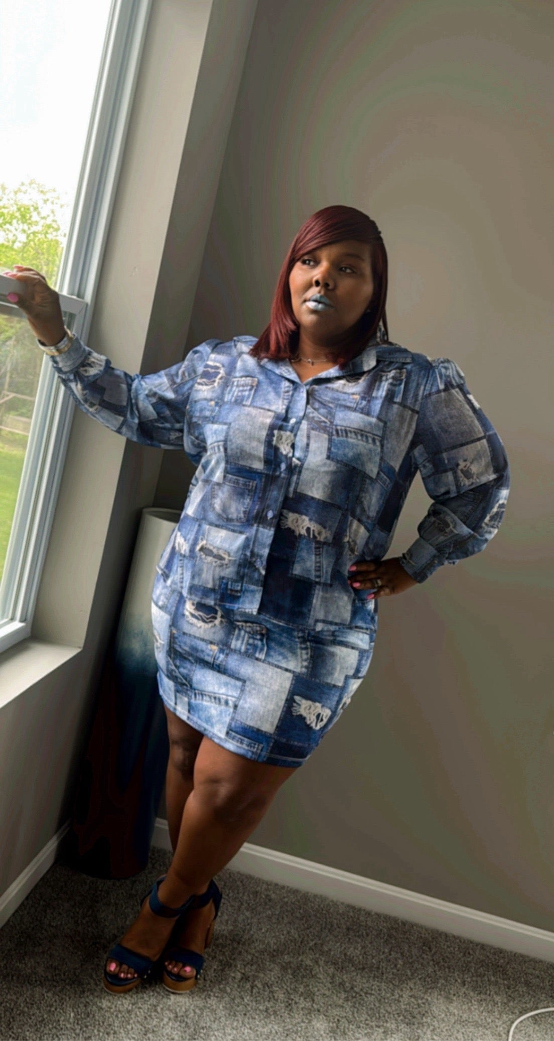 Take a risk and stand out in our Hello Texas Denim Set! This two piece set features a non-stretch, see-through top with a collar and long button closure sleeves. The high-waisted skirt has an elastic waistband for comfort. Available in size 2X. Are you ready to make a bold statement?