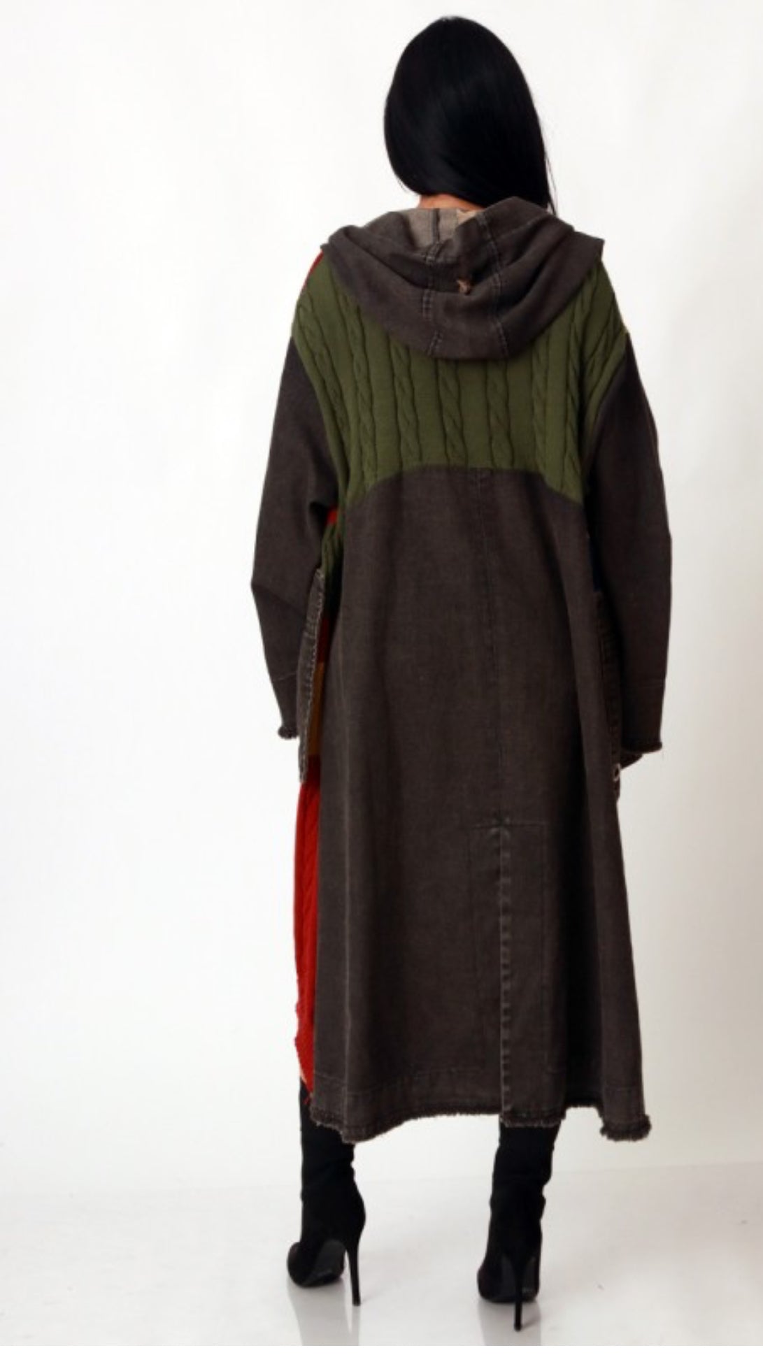 Make a bold statement with the Leah Color Block Denim Jacket. This retro-inspired piece features vibrant color block patches in cozy sweater material on the front and back, blending edgy denim with unique textures. The distressed hoodie adds a rebellious touch, perfect for pairing with cute boots, Timberlands, or thigh-highs to turn heads wherever you go. Embrace daring style and effortless attitude in this standout jacket.