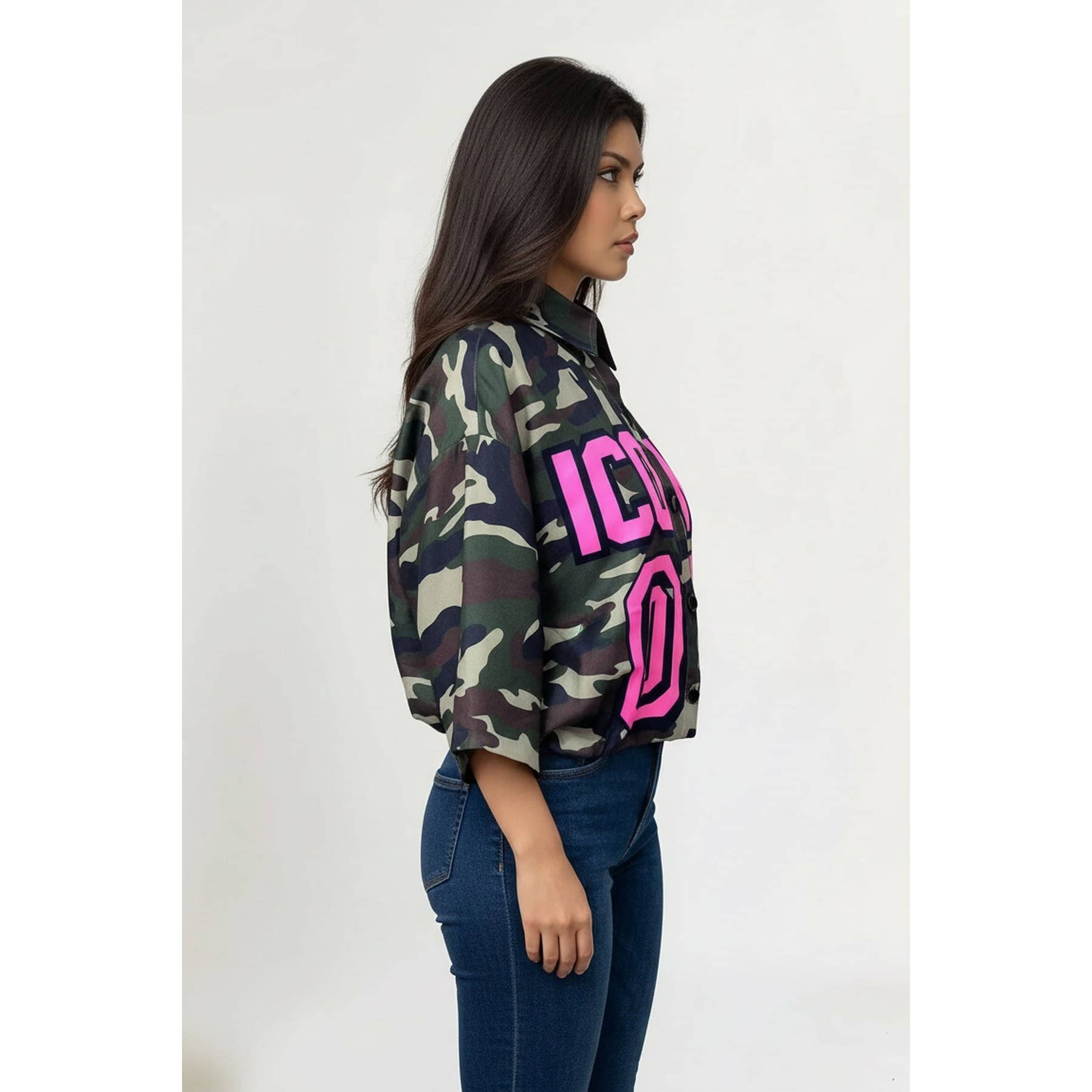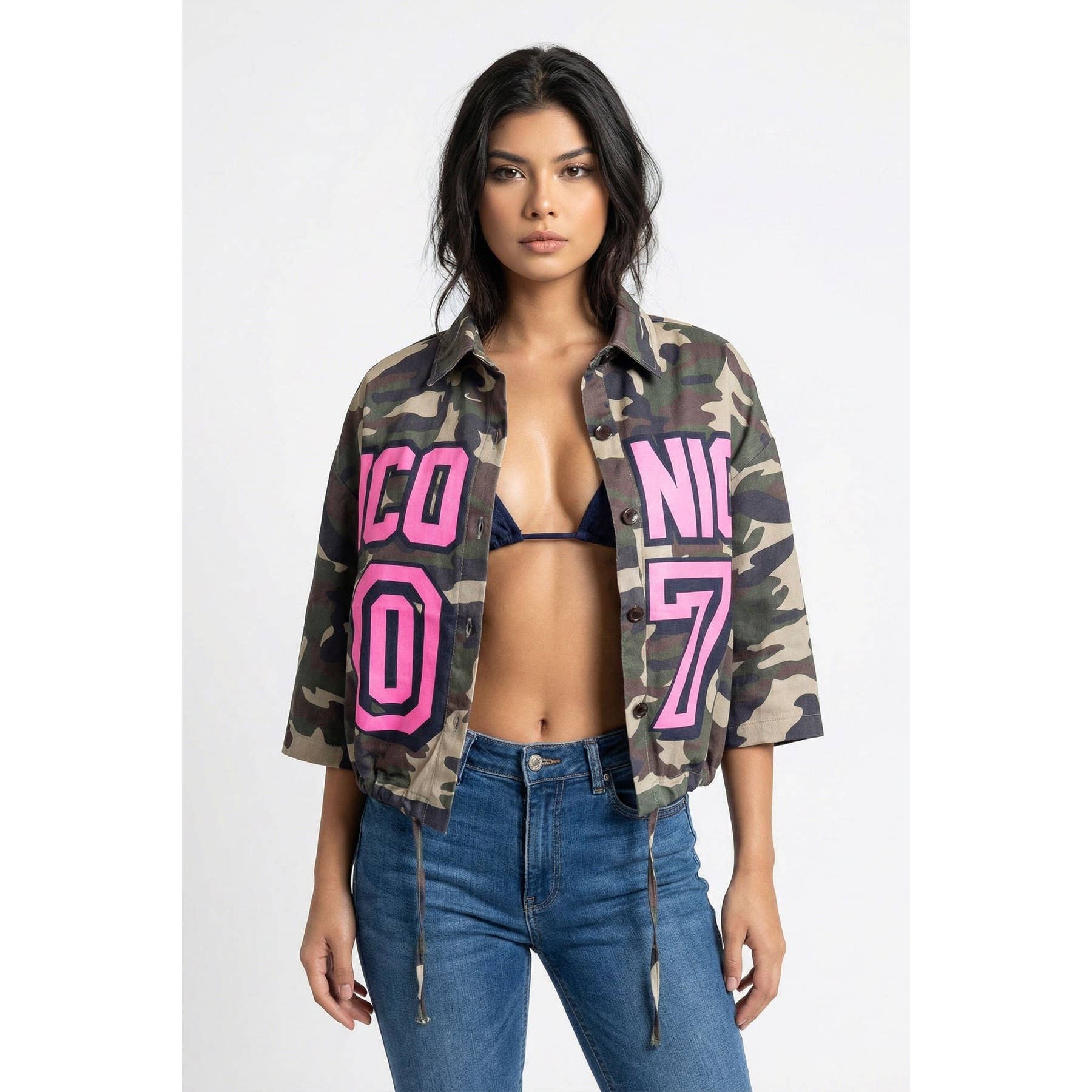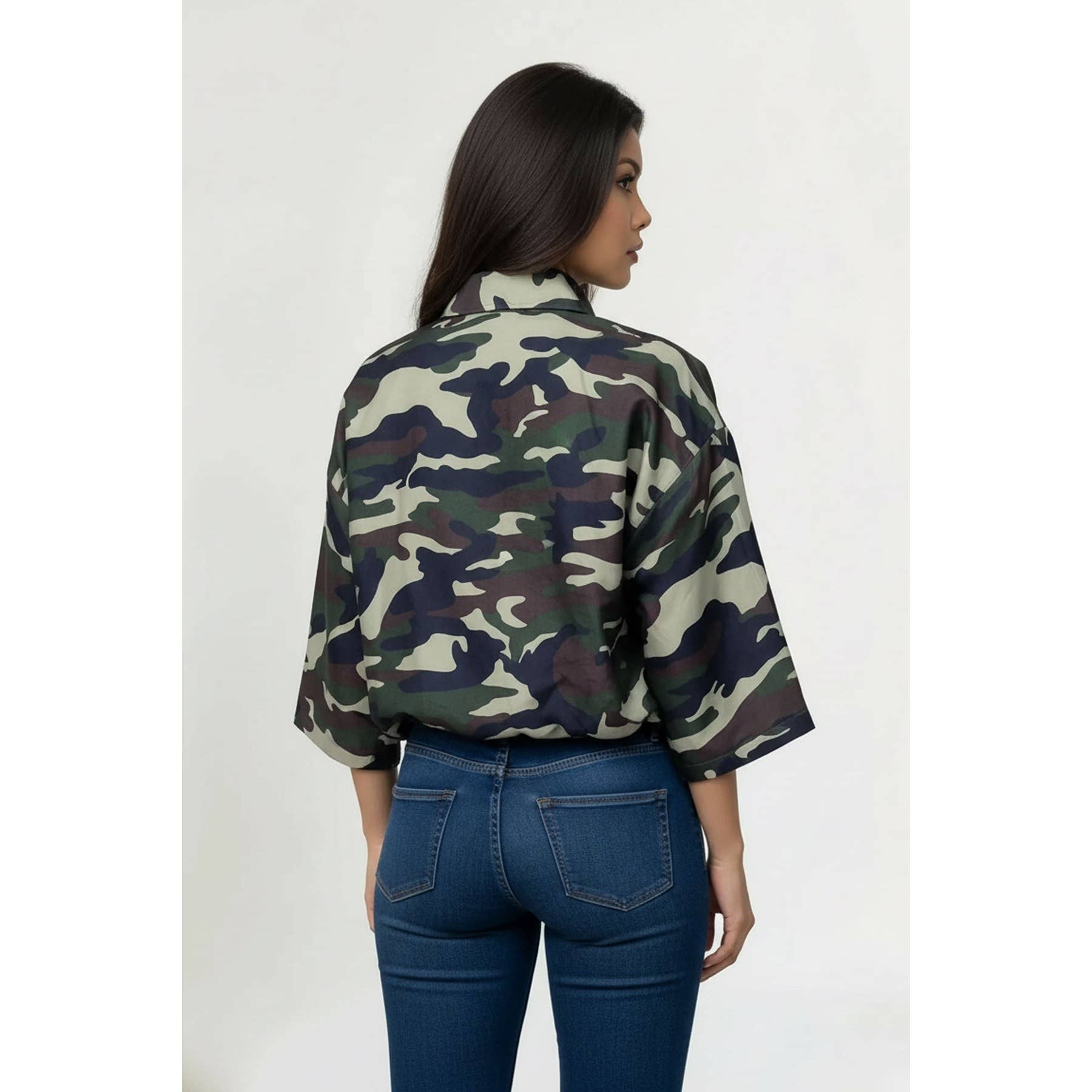 Graphic Collared Front Button Closure Drawstring Tie Hem Jacket Top
