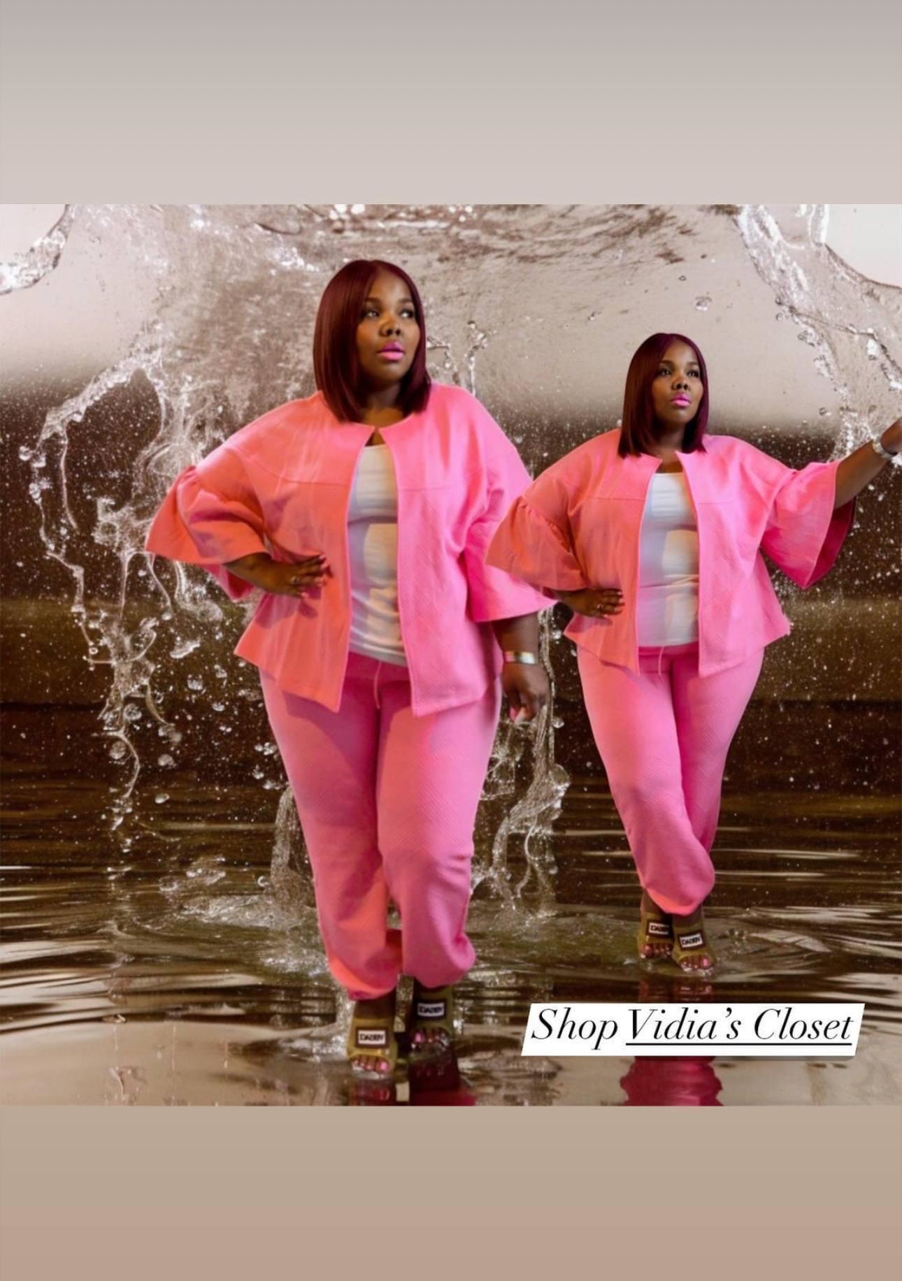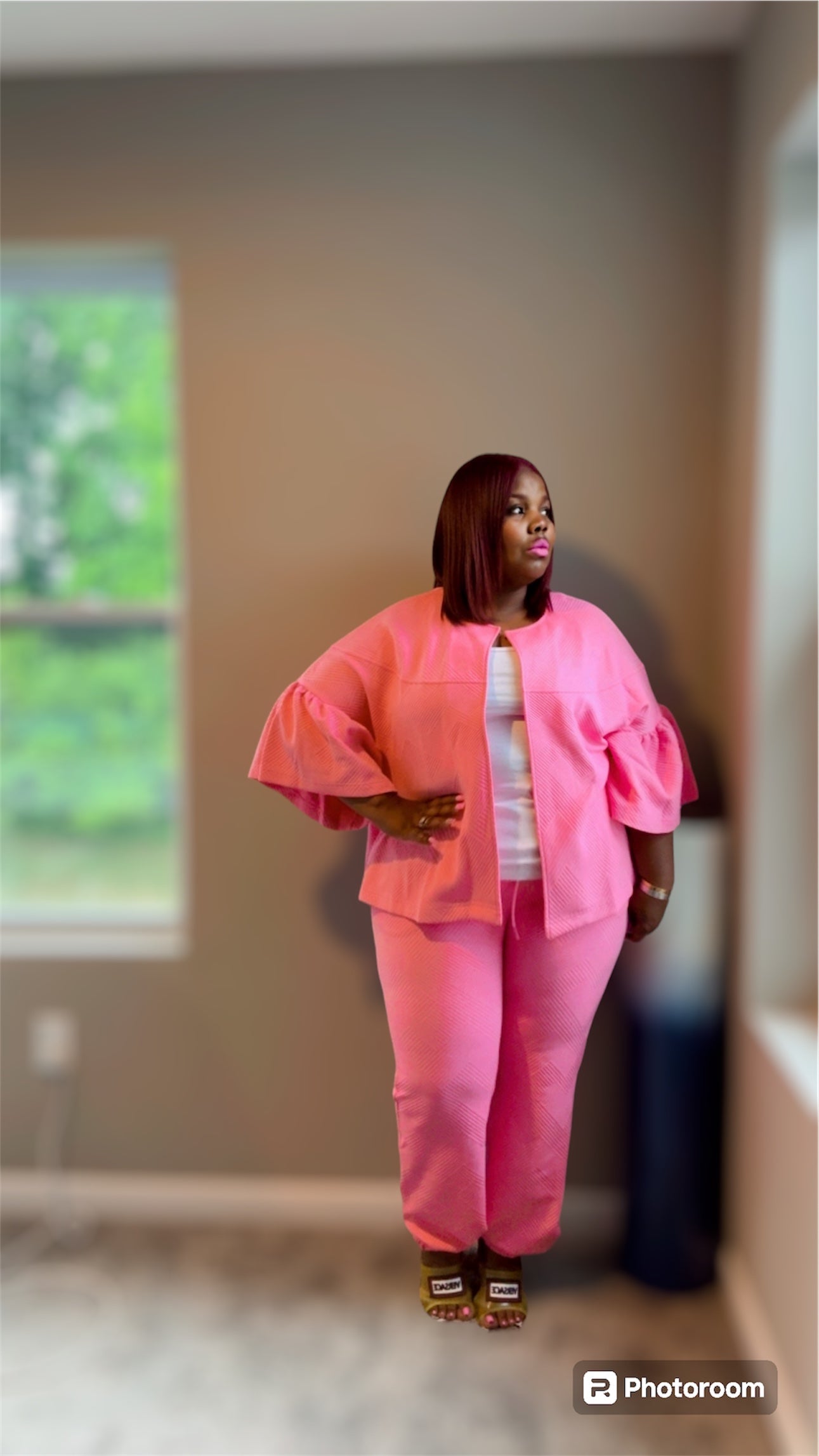 Indulge in luxury and take a fashion risk with the Pretty In Pink Set. Our versatile jogger and jacket will add a touch of elegance to any occasion with ruffle-like sleeves, a drawstring waist, and an exquisite clasp. Elevate your wardrobe with this exclusive collection.