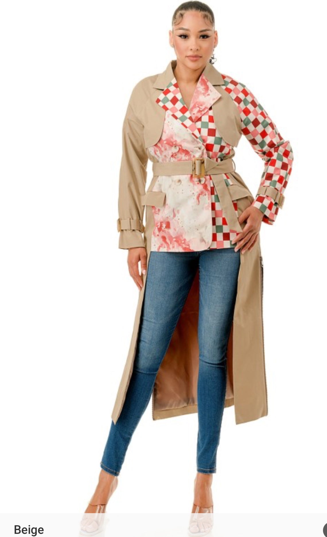 This statement piece demands attention with its bold pattern and rich color palette. A front-button blazer meets trench coat sophistication, crafted with generous stretch for movement that matches your lifestyle. The self-tie belt cinches at your command—wear it structured for boardroom power or loose for effortless cool. Layer it over everything from slip dresses to tees, throw it on solo, or knot it at the waist for an unexpected silhouette. For the woman who refuses to blend in, this is the versatile essential that rewrites the rules. First Model wearing size Large, second model wearing size small.