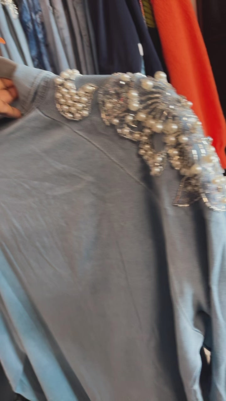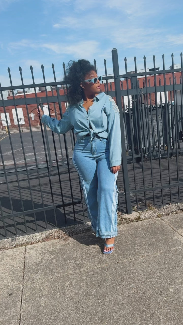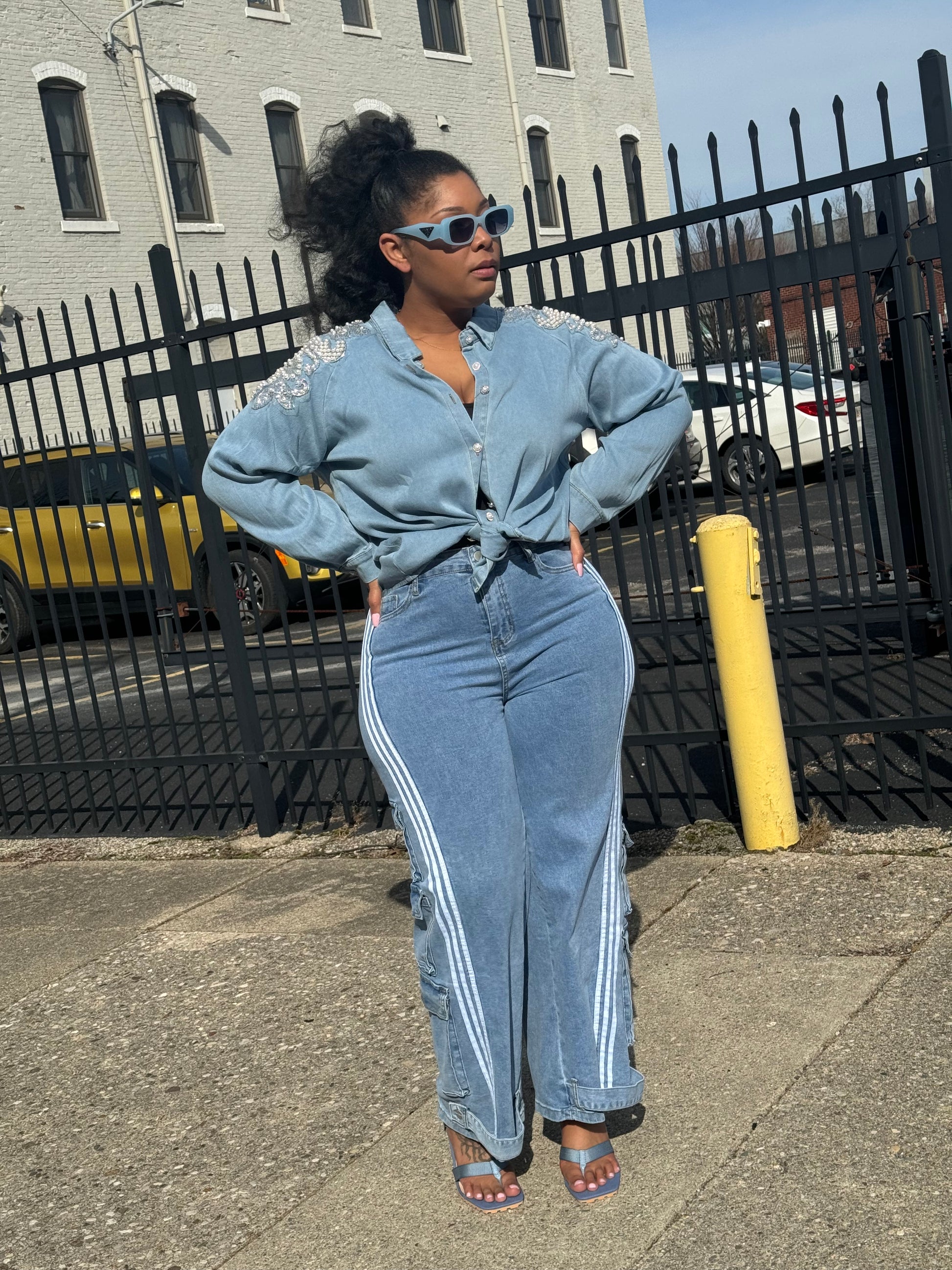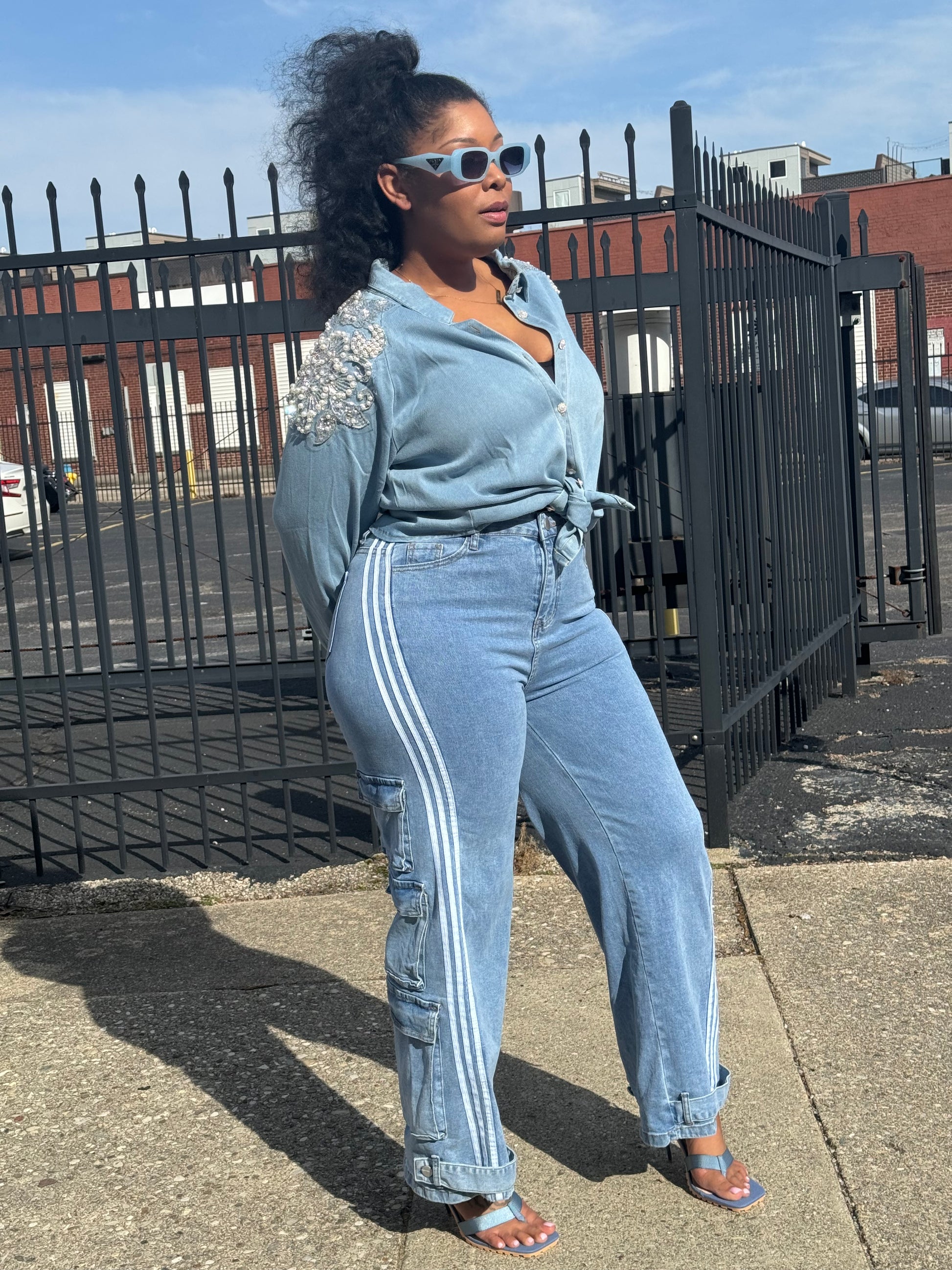 Take your denim game to the next level with the Diamonds & Pearls Jean Shirt! This curvy girl shirt features sparkling diamonds and pearls on the sleeves for a touch of glam. The pearl button down detail adds a classic touch to this light denim shirt, making it the perfect piece to pair with any outfit. Model wearing size XL paired with Lachelle denim, frames and heels from our showroom floor