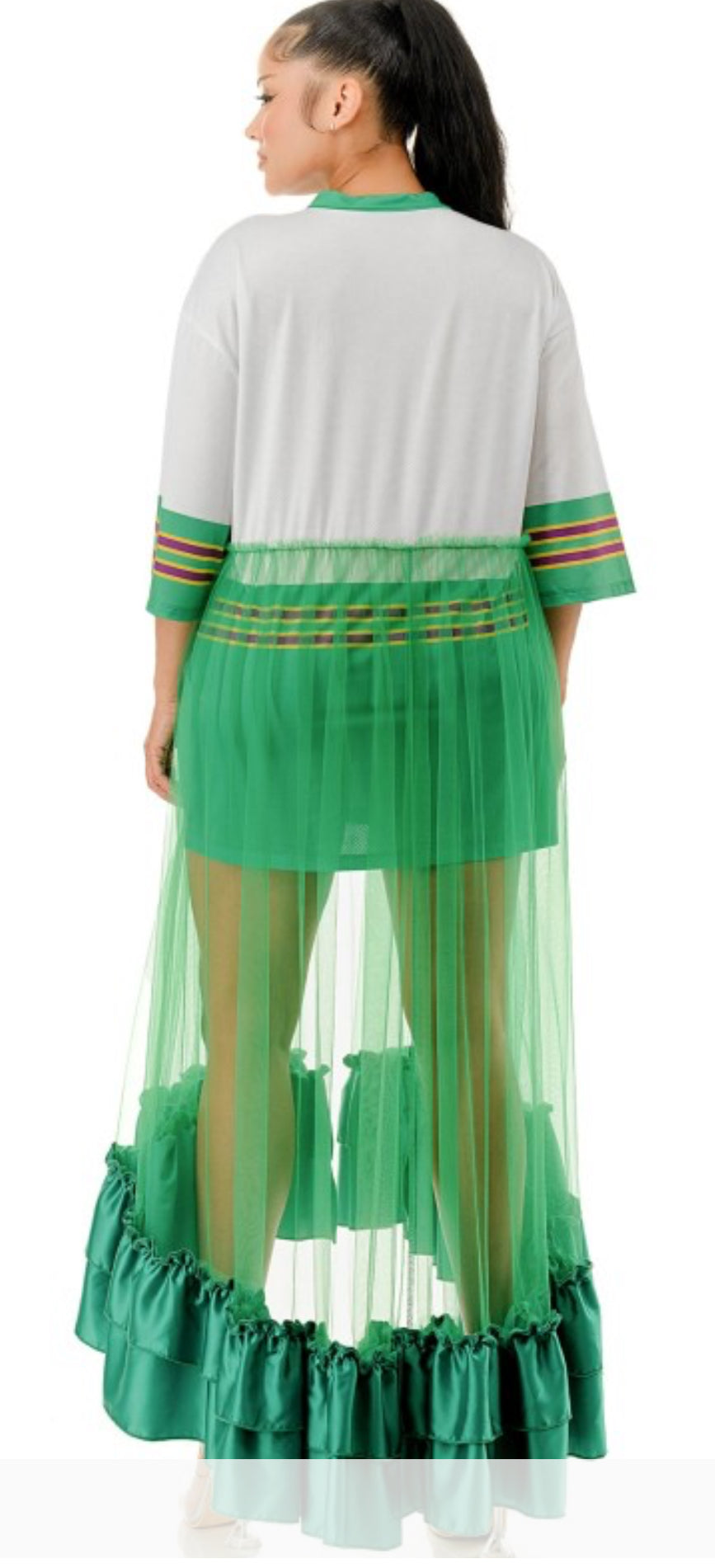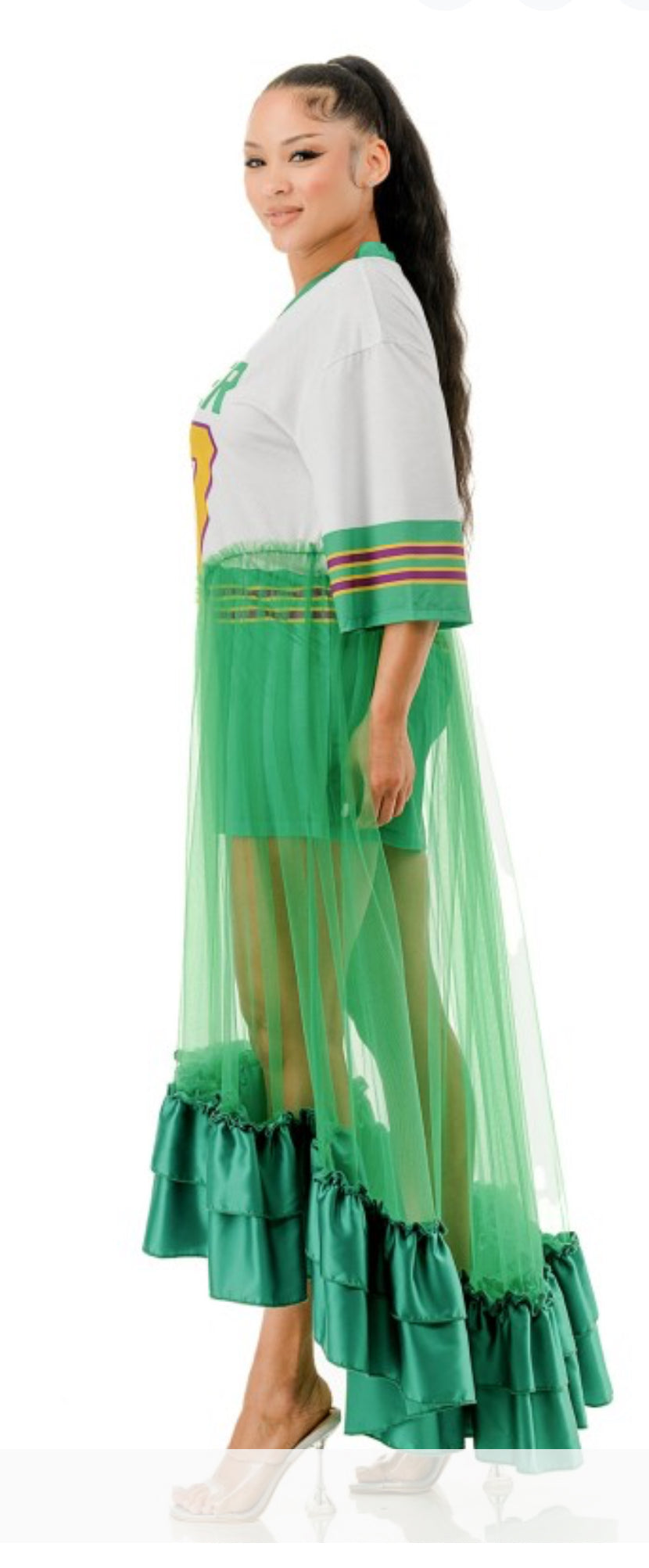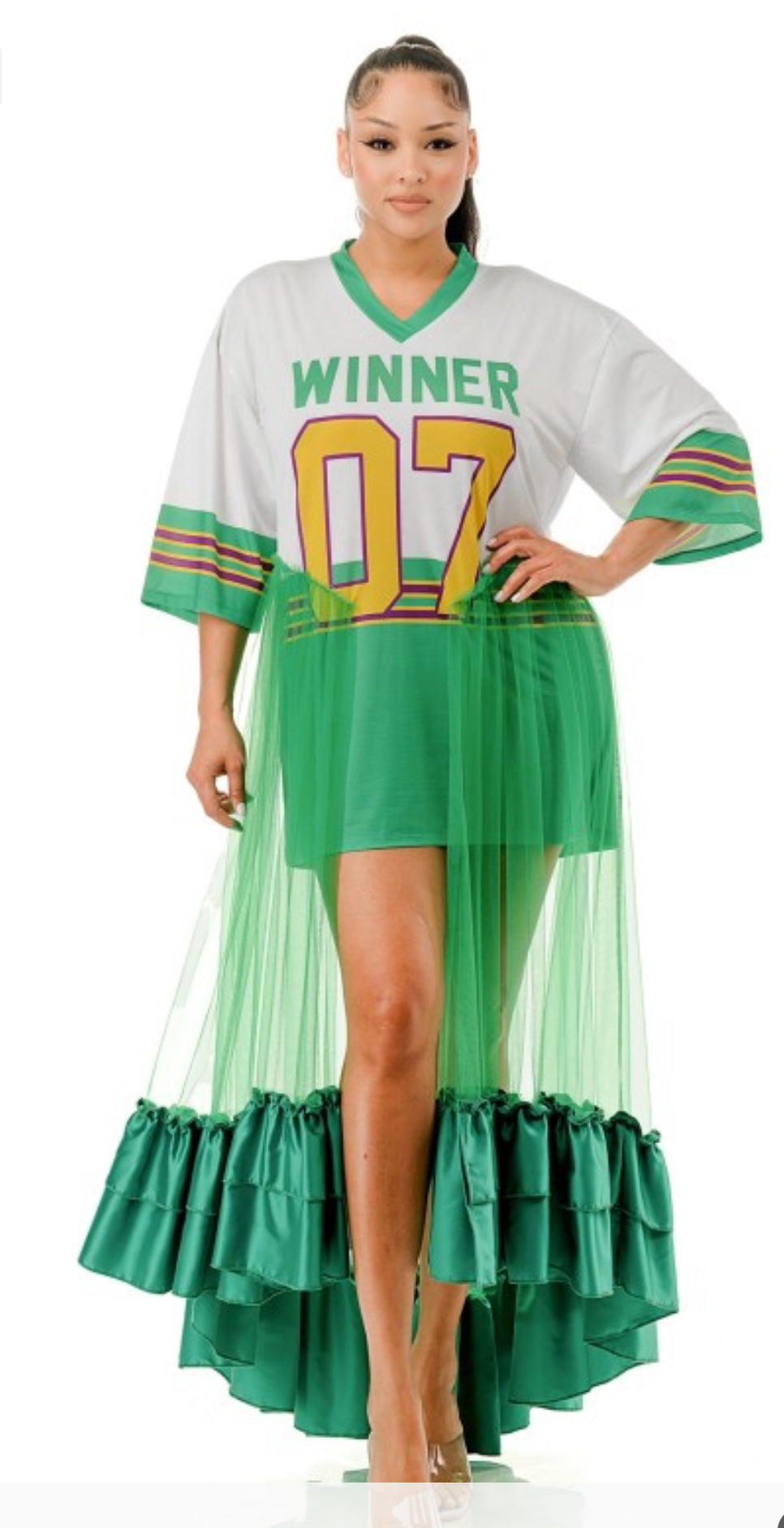 Stand out boldly in the Winner Within Jersey, a plus size oversized top featuring a playful ruffle hem. Its vibrant green and white design, highlighted by a striking yellow number 7 and "Winner" lettering, invites you to embrace your unique style with confidence. Dare to be different and make every moment a victory in this fun and flattering jersey.